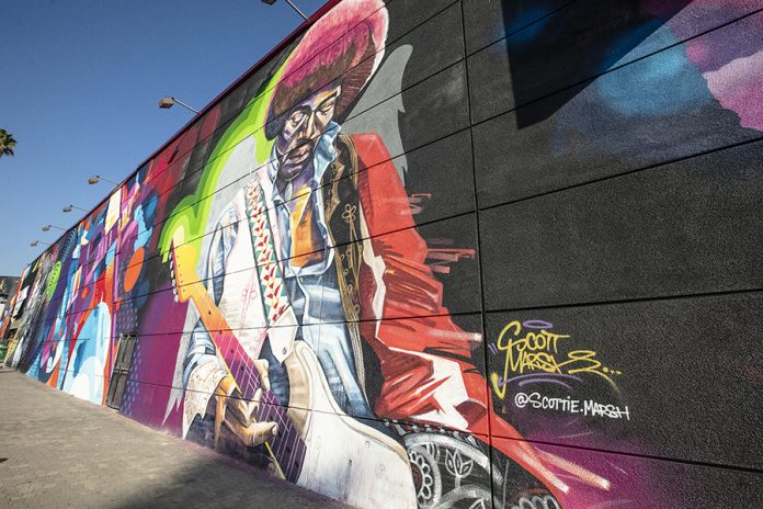 To mark the re-opening, the company commissioned a bright new mural for the full-block façade of the store. Designed by street artists Amanda Lynn, Scott Marsh and Patrick Griffith, the mural prominently features Jimi Hendrix: ‘…alongside an up-and-coming artist finding her sound, with a collage of musical instruments that symbolize bringing the community together in harmony’.