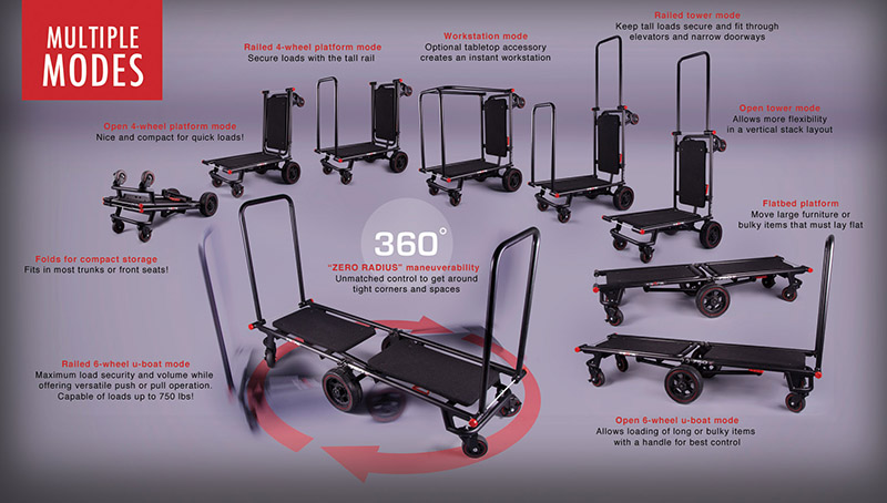 The new AMG 750 All-Terrain cart features larger 10” pneumatic wheels and 6” locking swivel casters, offering excellent handling and maneuverability. It is designed for use on a wide range of terrains including streets, sidewalks, curbs, grass, mud, gravel and other uneven surfaces, with minimum effort. The added 2” height compared to the previous model provides better clearance on rougher terrain. Its unique 6-wheel “u-boat” configuration of having 2 large center wheels and 4 swivel casters offer stability, distribute the load more evenly across the frame and provide a zero-degree turning radius. This heavy-duty hauler effortlessly transforms into nine different configurations including a 4-wheeler cart, a tall tower cart, and a 52” long-bed flat cart. It’s capable of loads up to 750 lbs (340 kgs) of gear, and comes equipped with 2 carpeted decks bolted to the carbon steel frame.