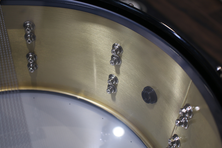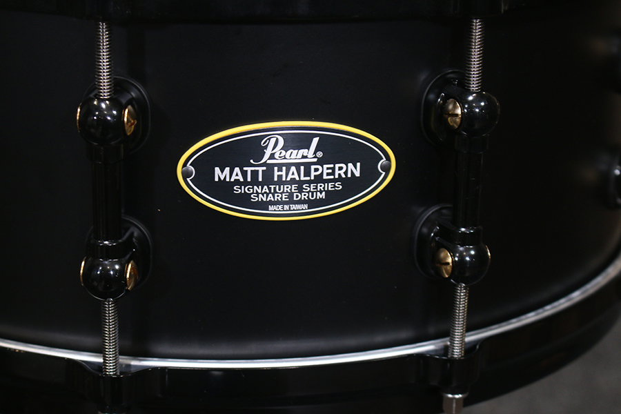 Pearl says…“Pearl Artist Matt Halpern designed each element of his Signature Snare Drum to complement -as well as contrast- the complex nature of his playing. Subtle touches, like black powder-coating and three shell vents help to temper the lively tone of its 1.5mm Brass shell. MasterCast die-cast hoops boost projection but Evans Heavyweight Dry heads deliver a controlled attack. Its SR150 Click-Lock strainer delivers increased sensitivity, while visual touches like black/brass STL Swivel Tube Lugs and striking yellow gaskets, serve to inspire the ideal performance. The end result is a snare drum with cutting, dry, versatility that responds quickly for aggressive play, and serves a variety of styles with an expanded tuning range.”