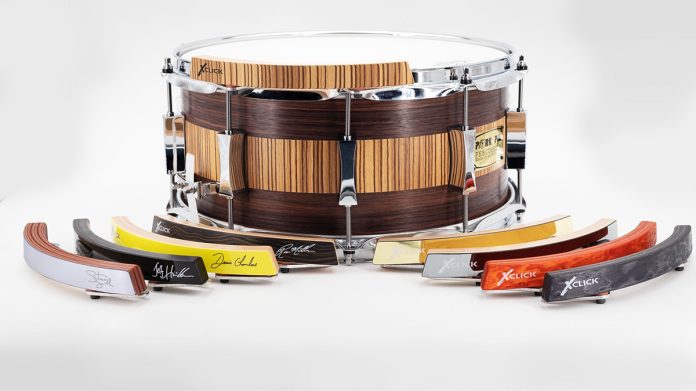 X-Percussion the high-tech, hand-crafted drum accessory maker founded by professional drummer Russ Miller and veteran drum designer and craftsman Bill Detamore, today announced the introduction of new CLICK-Mates Pork Pie snare drums and an expanded offering of limited edition CLICKs for 2023. The X-Percussion CLICK instrument provides players with an optimal and enhanced cross-stick sound courtesy of a 24-ply, hybrid North American Hard Rock Maple and pure copper sheet lamination.