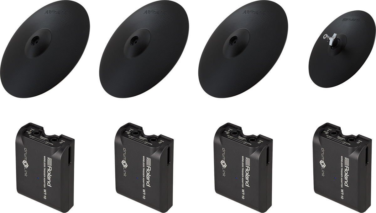 The Roland 4CY-4WT-01 DrumLink Cymbal Pack provides a ready-made solution for outfitting a DWe acoustic-electronic wireless convertible drum set with Roland’s leading electronic cymbals. These expressive pads deliver authentic feel, response, and movement, and have very low in-room noise levels when played. This bundle includes three CY-16R-T crash/ride pads, one VH-10 V-Hi-Hat pad, and four WT-10 Wireless Trigger Adapters that communicate with the kit’s DWe DrumLink Wireless Hub. Drum Workshop also offers complete four- and five-piece DWe kit bundles with Roland V-Cymbals and WT-10 units included.