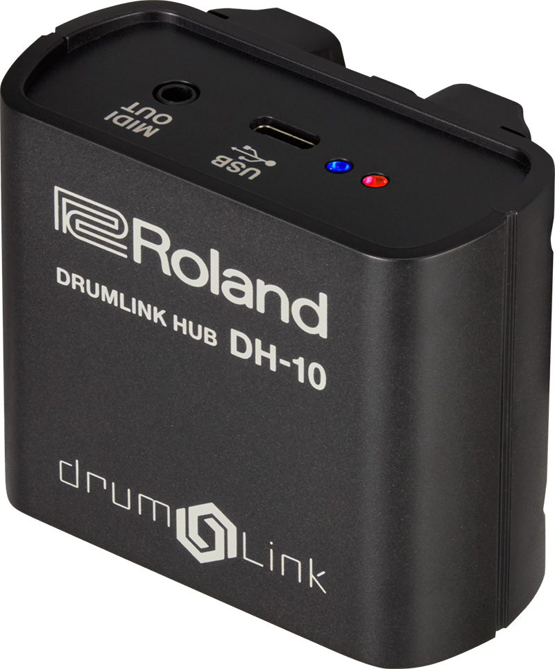 The compact DH-10 DrumLink Hub captures trigger signals from up to 15 WT-10 units, which are sent to the sound module or a computer via a simple USB-C connection. The DH-10 also has a TRS MIDI output for sending trigger signals to any sound source that receives MIDI note messages and CC data.