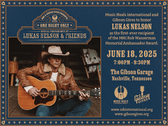 “Gibson Gives is proud to support the remarkable programs and mission of Music Heals International,” adds Erica Krusen, Global Executive Director of Gibson Gives. “We are especially excited to honor Gibson artist, Lukas Nelson with the inaugural Rob Wasserman Memorial Ambassador Award at our Gibson Garage in Nashville–celebrating not only his artistry, but the profound impact he and Music Heals International continue to make through the power of music.”