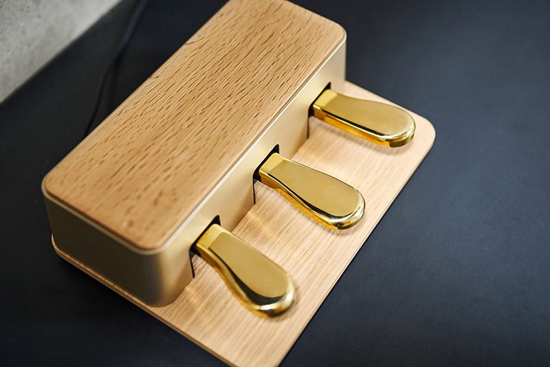 With its sharp lines and right angles, the KF-25 evokes the best of two diverse cultures. The design style is known as Japandi, a fusion of austere Japanese wabi-sabi (侘び寂び) and the effortless functionality of Scandinavian furniture. The deep-toned Smoked Oak finish enhances the natural wood grain and was selected to complement the instrument’s clean, linear appearance.